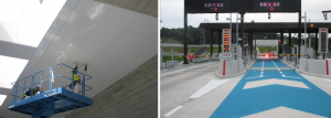 ⾼速道路の料⾦所周辺に設置するETC⽤電波吸収体や、レーン遮断機、LED表⽰板、逆⾛防⽌システム等、道路の安全・安⼼にかかわる製品を製造しています。