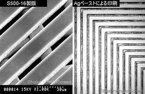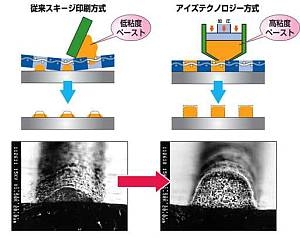 これにより、高アスペクト比、低コスト化、高生産性が実現され、スクリーン印刷法の量産細線限界が大きく変わり、これまでフォト法に依存していた有機体パッケージをはじめとする各種の電子部品の製造方法の常識を覆す、新たな微細回路形成技術です。